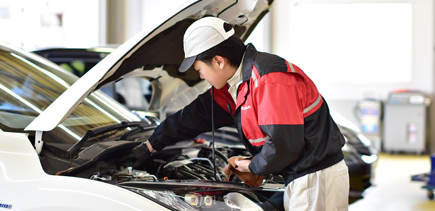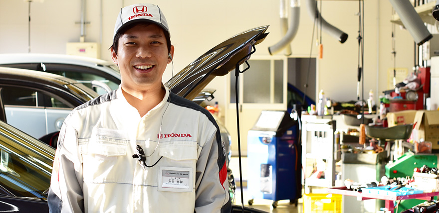 A.大学に通っていて「就職するなら手に職を付けたい」と思い、大学卒業後に整備学校に入校することに決めました。学校選びは元々Hondaが好きだったので、Honda系の整備学校に入りたかったんですが、愛知県にはなかったため日産系の整備学校で整備を学びました。就職先探しはHonda Carsのディーラーで探していて、Honda Cars 東海と愛知県のもう一つ大きいところを受けていたところ、Honda Cars 東海は、面接や筆記などの入社試験の回数が少なく、内定もすぐ頂けたので、Honda Cars 東海に入社することを決めました。